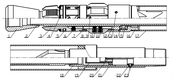 上接頭、“O”型圈、卡爪、卡爪彈簧、扶正塊彈簧、卡瓦座、滑道、滑動銷釘、連接銷釘、**管、單流閥、鎖釘、防脫銷釘?shù)冉M成。
